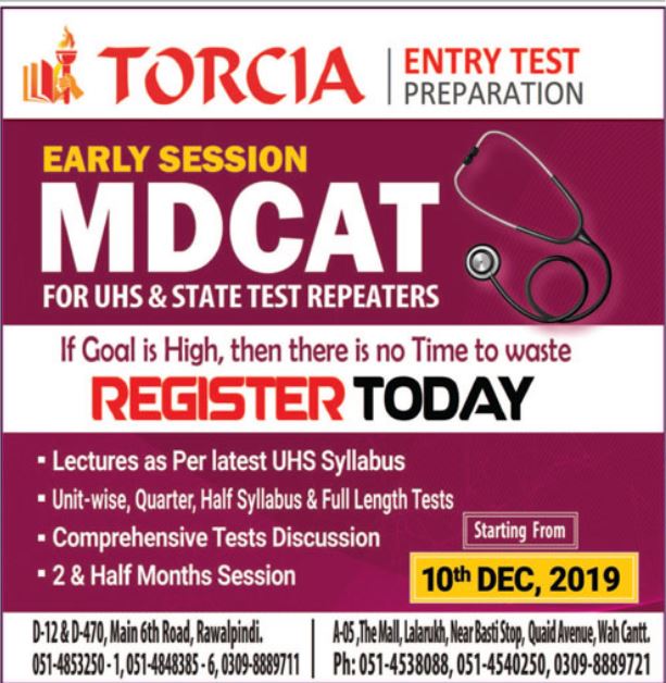 Torcia Rawalpindi has announced admissions for Entry Test MDCAT Preparation for UHS & State Test Repeaters. Classes will be starting from 10 Dec 2019.