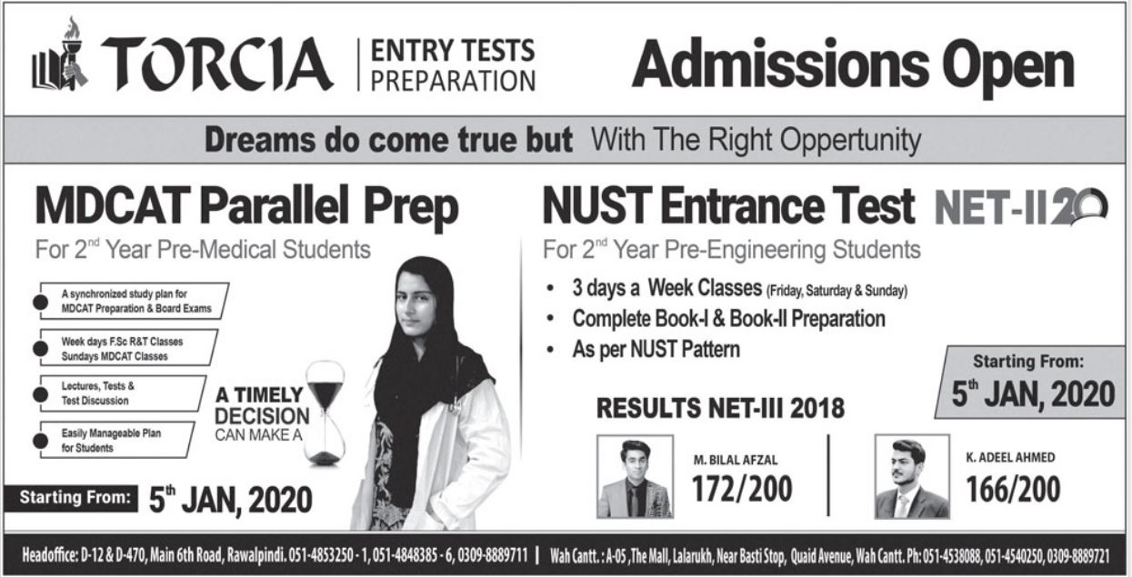 Torcia Rawalpindi has offered admissions for Entry Test Preparation for MDCAT, NUST Entrance Test. Classes will be starting from 05 Jan 2020.