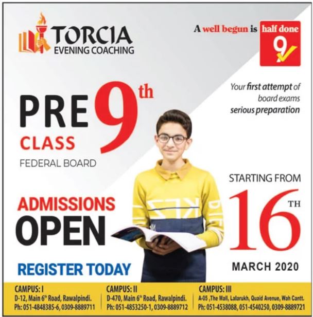 Torcia Evening Coaching Rawalpindi has been offering admissions for Pre-9th class for the session 2020-21. Classes will be starting from 16 March 2020. Admissions are open.