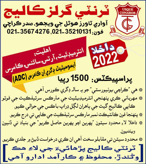 Trinity Girls College TGC Karachi is pursuing to open TGC Admissions 2022 and inviting to Aspirants on prescribed admission forms for granting TGC Karachi Admissions 2022. Trinity Girls College Karachi Admissions 2022 are announced in Associate degree in Commerce ADC. Candidates should have Intermediate education in Arts, Science or Commerce to apply for Trinity Girls College ADC Admissions 2022 as per mentioned in advertisement. Admission Application Forms can be submitted Trinity Girls College Admissions 2022 eligibility criteria. Trinity Girls College Karachi ADC Admissions 2022 are processing.