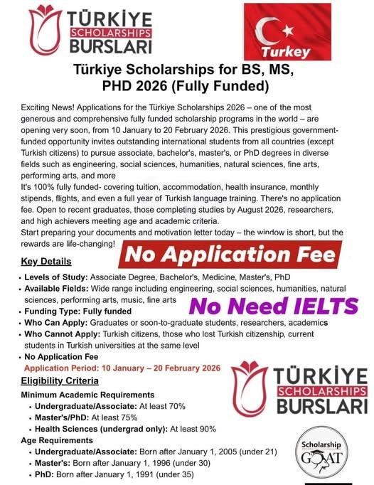 Great news for international students! Applications for the Türkiye Scholarships 2026 are now open. This is one of the most prestigious and generous fully funded scholarship programs in the world, offering more than 10,000 scholarships every year. The application period runs from 10 January to 20 February 2026. The students can get latest updates of Türkiye Scholarships 2026 for BS, MS, and PhD Fully Funded.