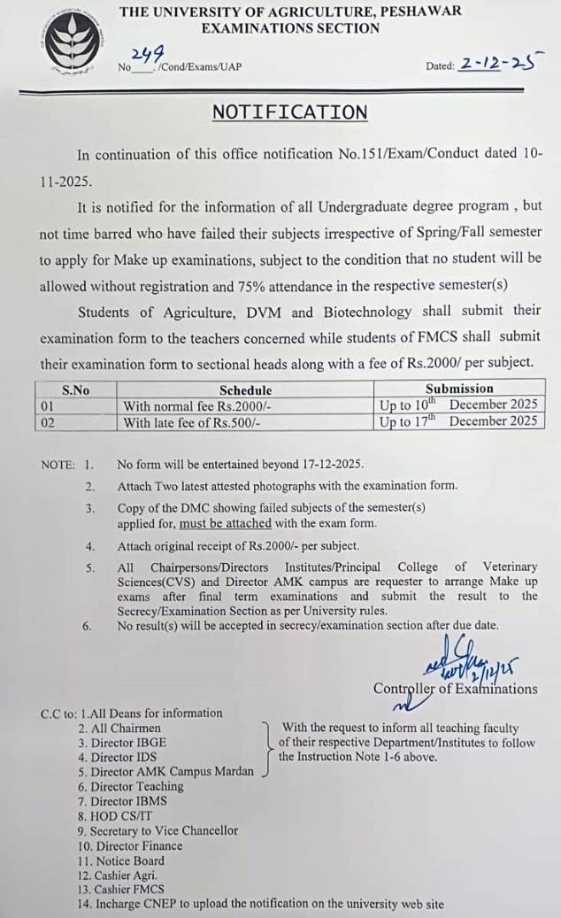 The University of Agriculture, Peshawar UAP, issues a critical alert for all undergraduate students. You must act fast! UAP allows students who failed subjects to apply for make-up examinations. The notification is a follow-up to an earlier announcement.