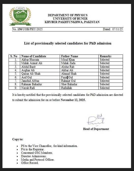 The University of Buner extends its best wishes to all successful candidates as they move closer to beginning their advanced research journey in Physics.