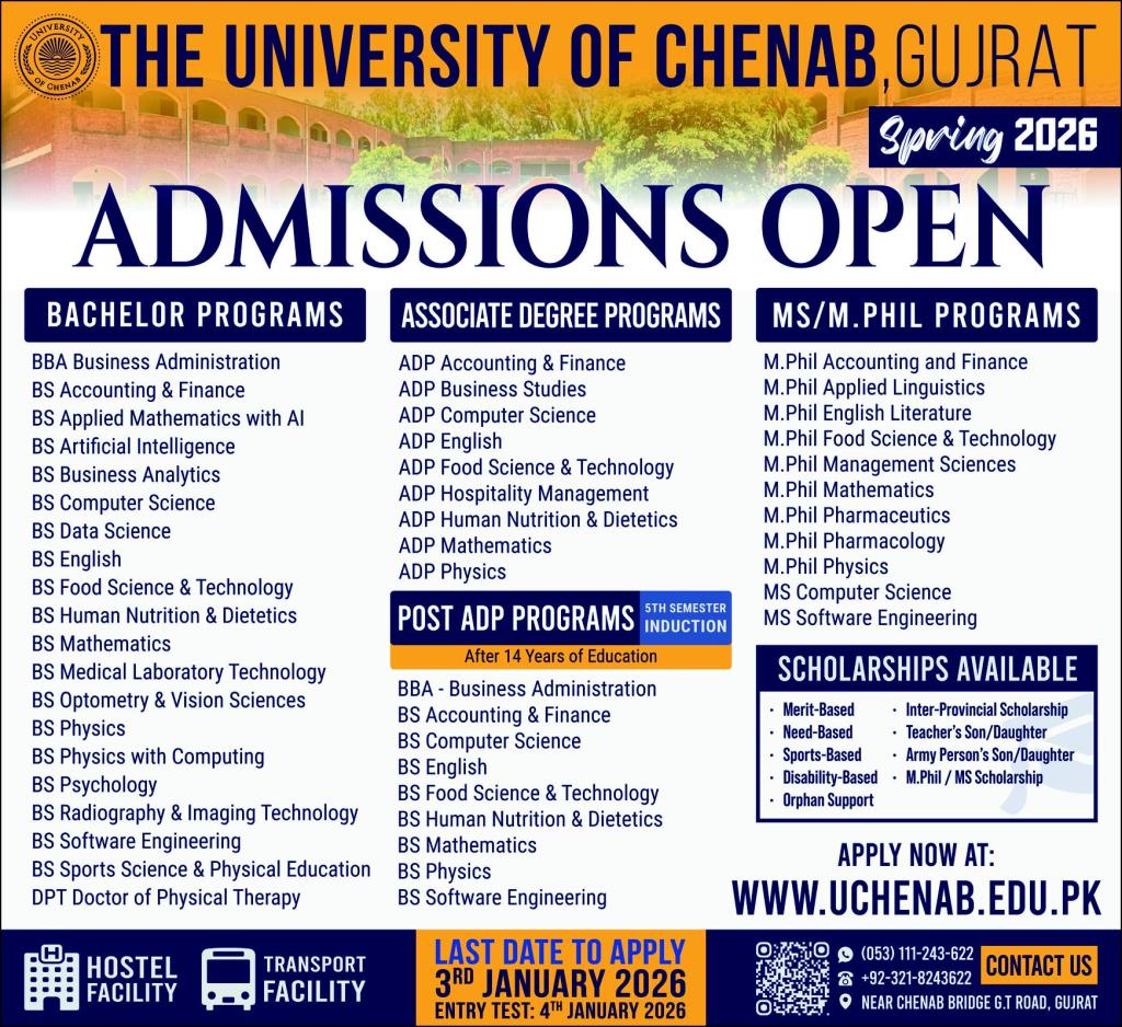 The University of Chenab UCHENAB, Gujrat is now accepting applications for Spring 2026 admissions. The university offers a wide range of undergraduate, associate degree, and postgraduate programs designed to prepare students for successful careers in academics, research, and industry.