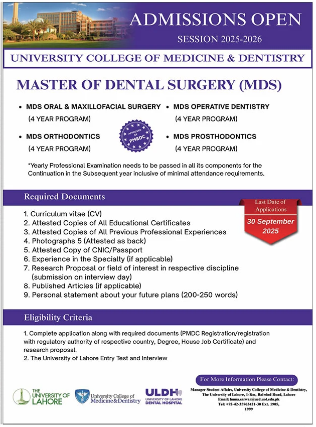 The University College of Medicine & Dentistry UCMD, a constituent college of The University of Lahore, is now accepting applications for its prestigious MDS Master of Dental Surgery programs for the academic session 2025–2026. These programs are recognized by PM&DC and offer advanced clinical and research-based education in multiple dental specialties.