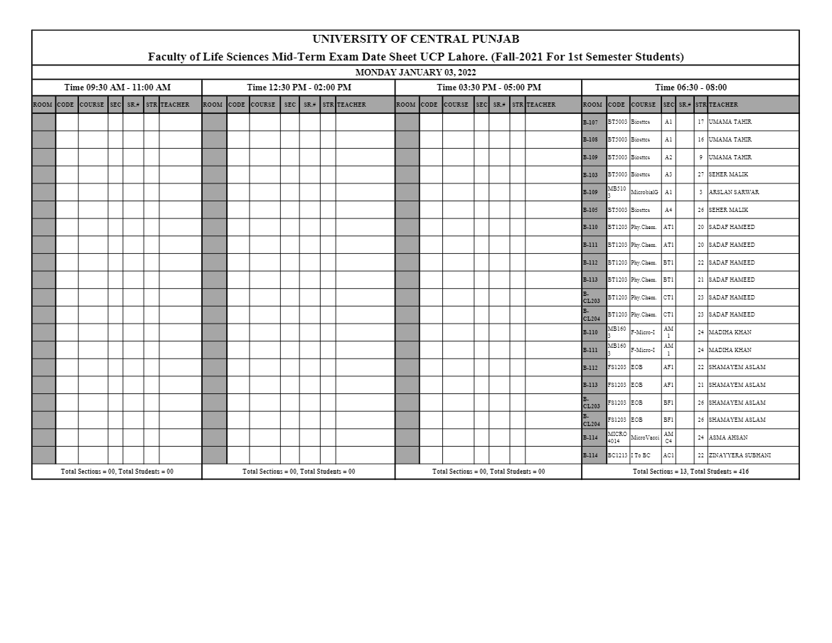 University of Central Punjab Lahore Examinations Department is managing the Faculty of Life Sciences Mid Term Fall Examination 2021 for the First Semester Students. For starting the Exam UCP Lahore has decided the Examination Schedule and updated the Date Sheet for the 1st Semester Students who have linked with Faculty of Life Sciences. Candidates must follow the Examination Schedule according to their Respective code/subject. Candidates are directed to reach at Examination Hall/Area 15 minute before for checking their seating arrangement. Mid Term Fall Examination 2021 will be started from January 03, 2022. Papers commencing Timings are vary, So, candidates are supposed to follow timings according to their course subject. Candidates must follow all rules and regulation regarding Examinations.