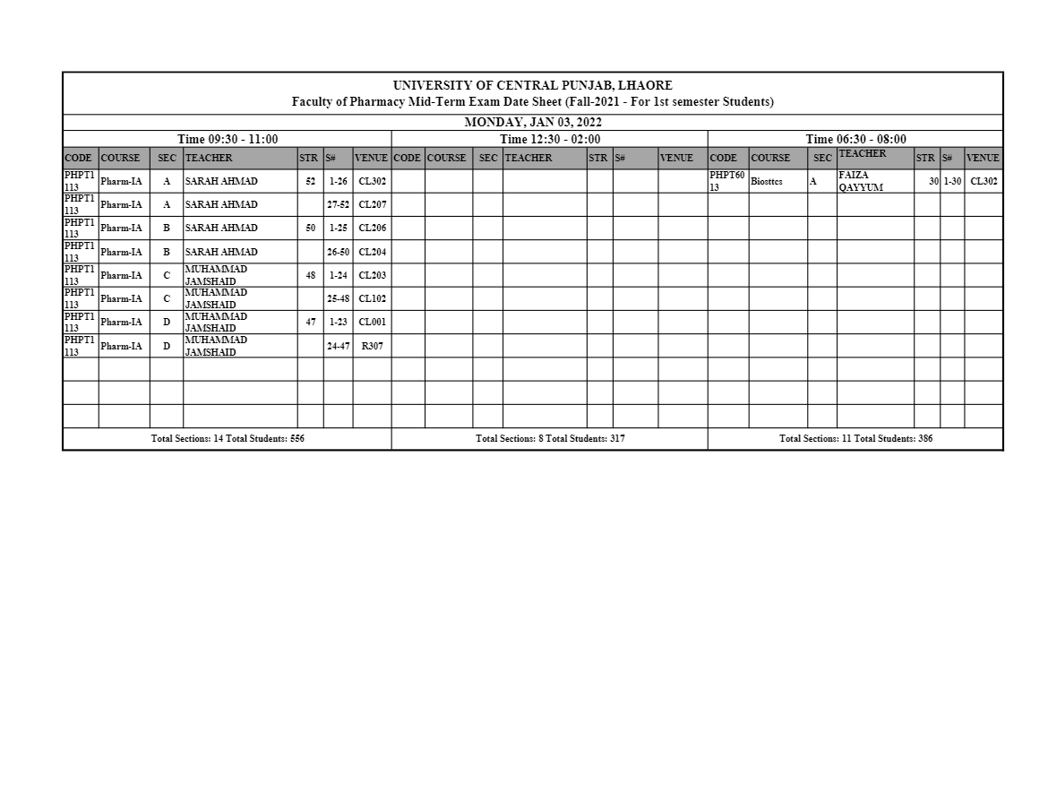University of Central Punjab Lahore Examinations Section updated Date Sheet for commencement of Faculty of Pharmacy Mid Term Examination Fall 2021 for the First Semester Students. Students who were preparing to appear in Mid Term Examination Fall 2021 are intimating to follow UCP announced schedule to appear in Examination. University of Central Punjab Lahore has scheduled Fall Examination 2021 that is going to be started in the month of January. Candidates shall started the implementation of Exam Schedule from January 03, 2022. UCP Lahore has accepted Examination Forms from concerned candidates who are appearing in Exam. Candidates are advised to check their Examination commencement timings carefully and Follow prescribed SOPs instructions for the prevention of Covid-19.