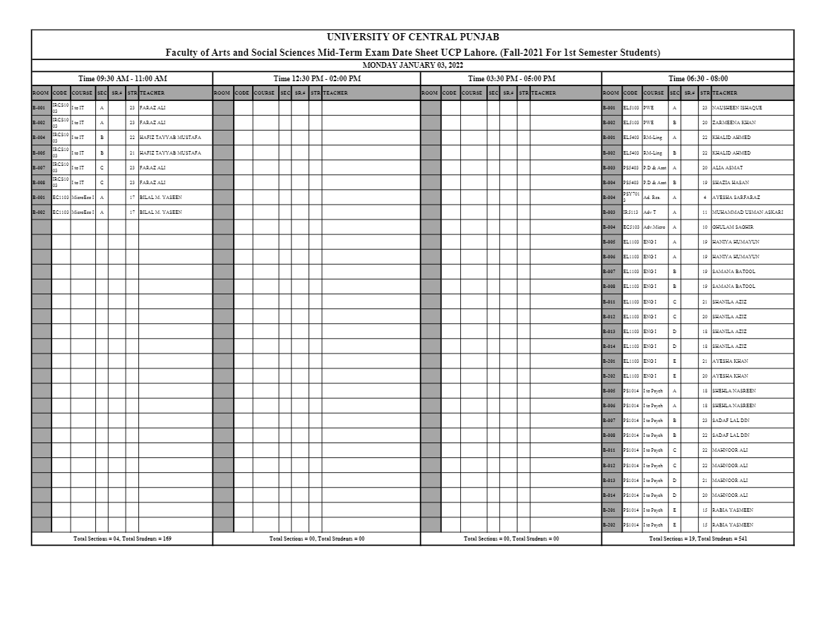 University of Central Punjab Lahore Examinations Section is going to settle the Faculty of Arts and Social Sciences Mid Term Fall Examination 2021 for First Semester Students. For commencement of Examinations UCP Lahore has issued Date Sheet. UCP Lahore is informed to concerned candidates who are preparing to appear in Mid Term Fall Examination 2021 that their Examinations have been scheduled to conduct in the month of January. Hence, Candidates shall follow Exam Time Table. According to issued Exam Schedule Examination is going to be managed from January 03, 2022. Candidates make sure their presence in Exam from January 03, 2022. Candidates are advised to check their Examination Venue carefully and Follow prescribed SOPs instructions for the prevention of Covid-19.
