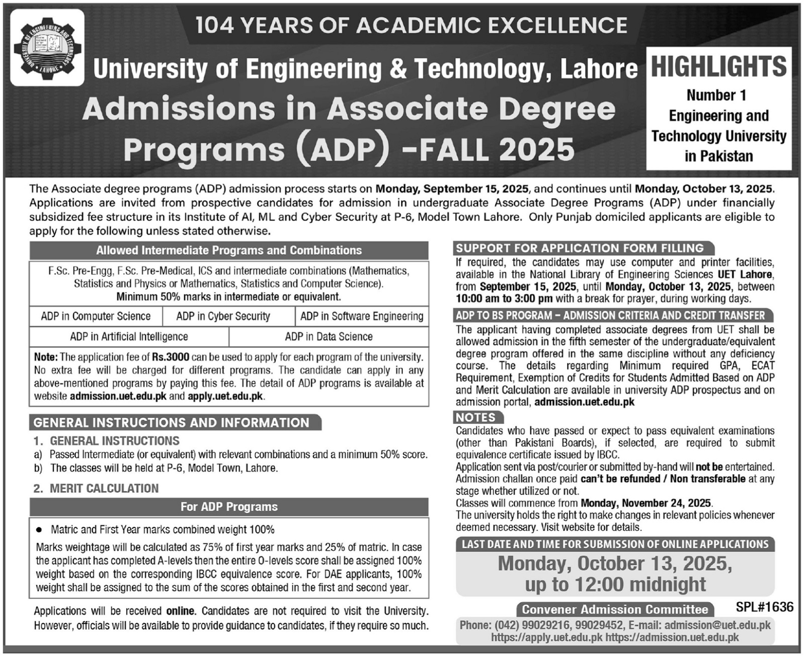 The University of Engineering & Technology UET, Lahore, proudly celebrating 104 years of academic excellence, has officially opened admissions for its Associate Degree Programs ADP for Fall 2025. As the #1 Engineering and Technology University in Pakistan, UET invites applications from talented and motivated students who wish to pursue careers in emerging fields of technology.