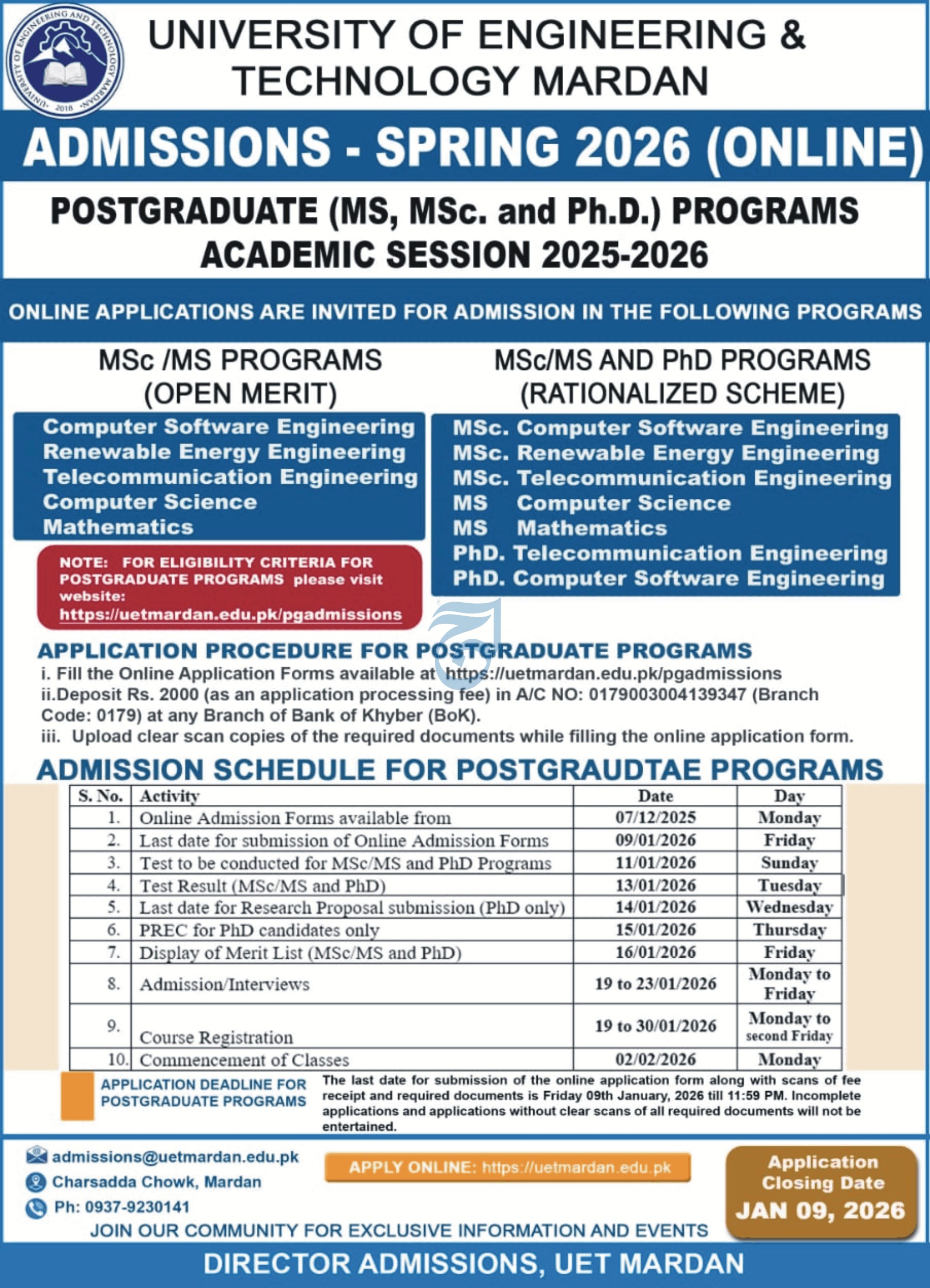 The University of Engineering and Technology UET invites online applications for admission to its MS, MSc, and PhD programs for Spring 2026. Aspiring scholars and professionals seeking advanced studies in engineering, science, and technology are encouraged to apply and become part of a vibrant academic community dedicated to research, innovation, and excellence.