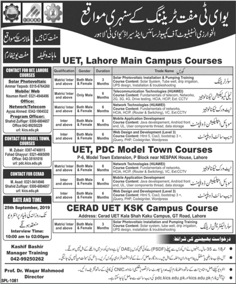 University of Engineering & Technology Lahore has announced admission for Free Diploma Courses in Solar Training, Telecommunication Technologies, Network Technologies, Mobile application development, Website development. Last date to apply 25 Sep 2019. Scholarships are available.