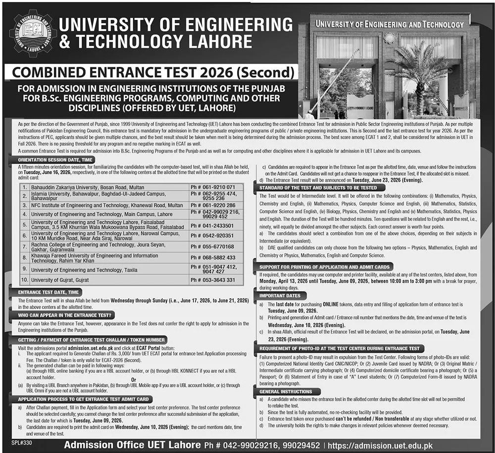 The UET Combined Entrance Test 2026 follows a strict administrative timeline. Candidates are urged to complete their online registration and token payments before the mid-June cutoff to avoid technical disqualification.