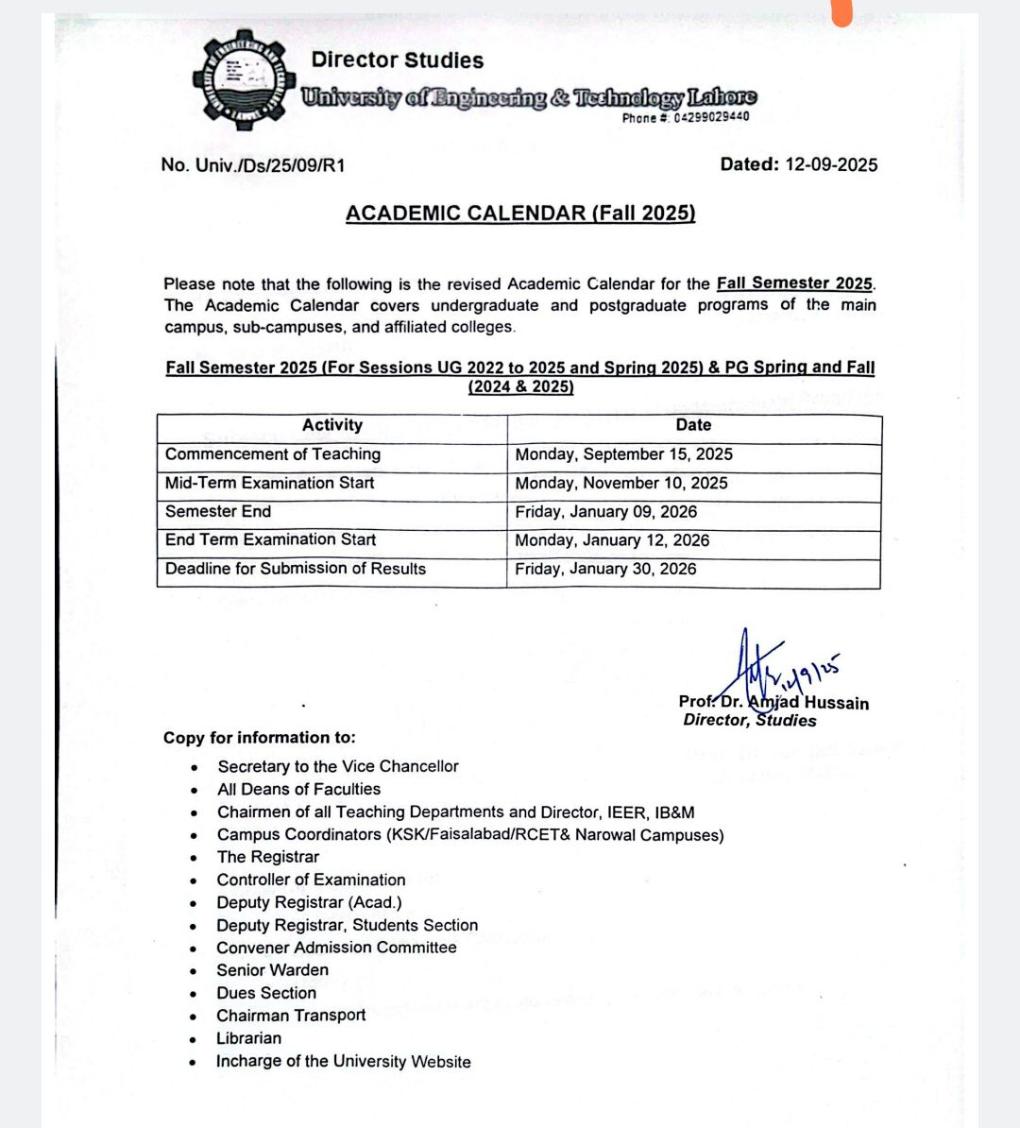 The University of Engineering and Technology UET Lahore has officially released its revised Academic Calendar for the Fall 2025 semester. This new schedule is crucial for all students in both undergraduate and postgraduate programs, including those at the main campus, sub-campuses, and affiliated colleges. Students can now plan their semester with confidence, knowing the key dates for classes, exams, and results.