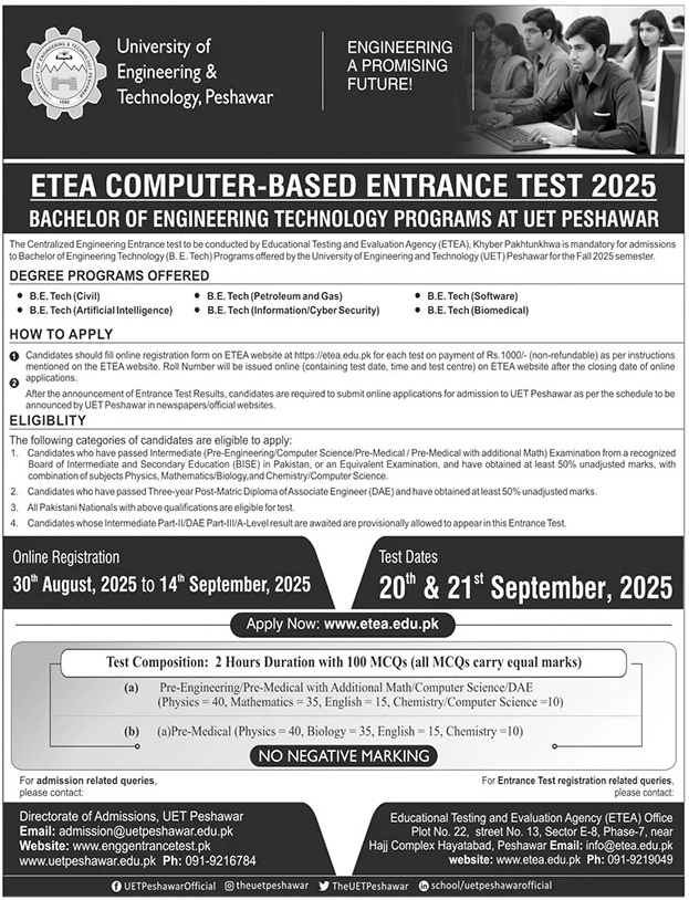 Once the ETEA Entrance Test results are announced, candidates must apply online for admission to UET Peshawar as per the official schedule published on: