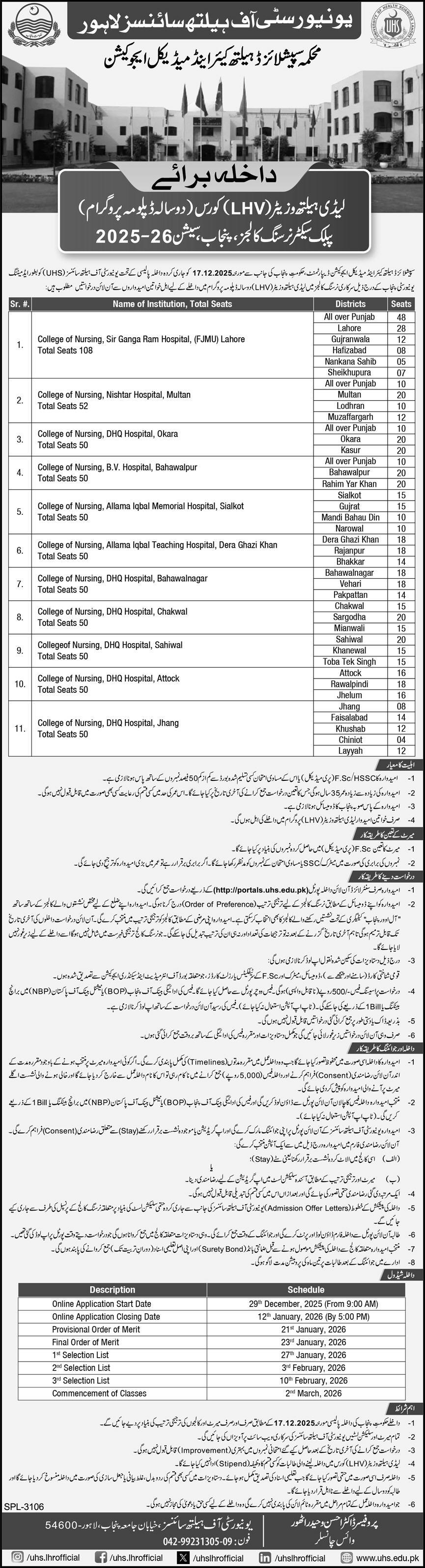The University of Health Sciences UHS, Lahore, in collaboration with the Specialized Health Care & Medical Education Department, Government of Punjab, invites applications from eligible female candidates for the Lady Health Visitor LHV 2-Year Diploma Program at public sector nursing colleges across Punjab for the session 2025–2027. The program will be conducted in accordance with the Punjab Government Admission Policy dated 17th December 2025.
