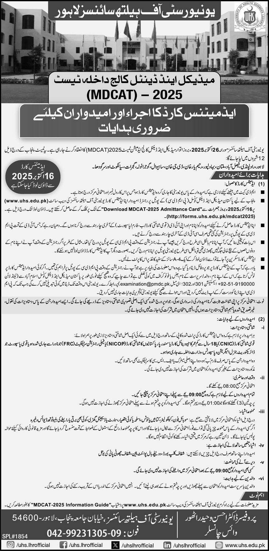 For further details and updates, candidates must carefully read the "MDCAT-2025 Information Guide" available on the official UHS website: