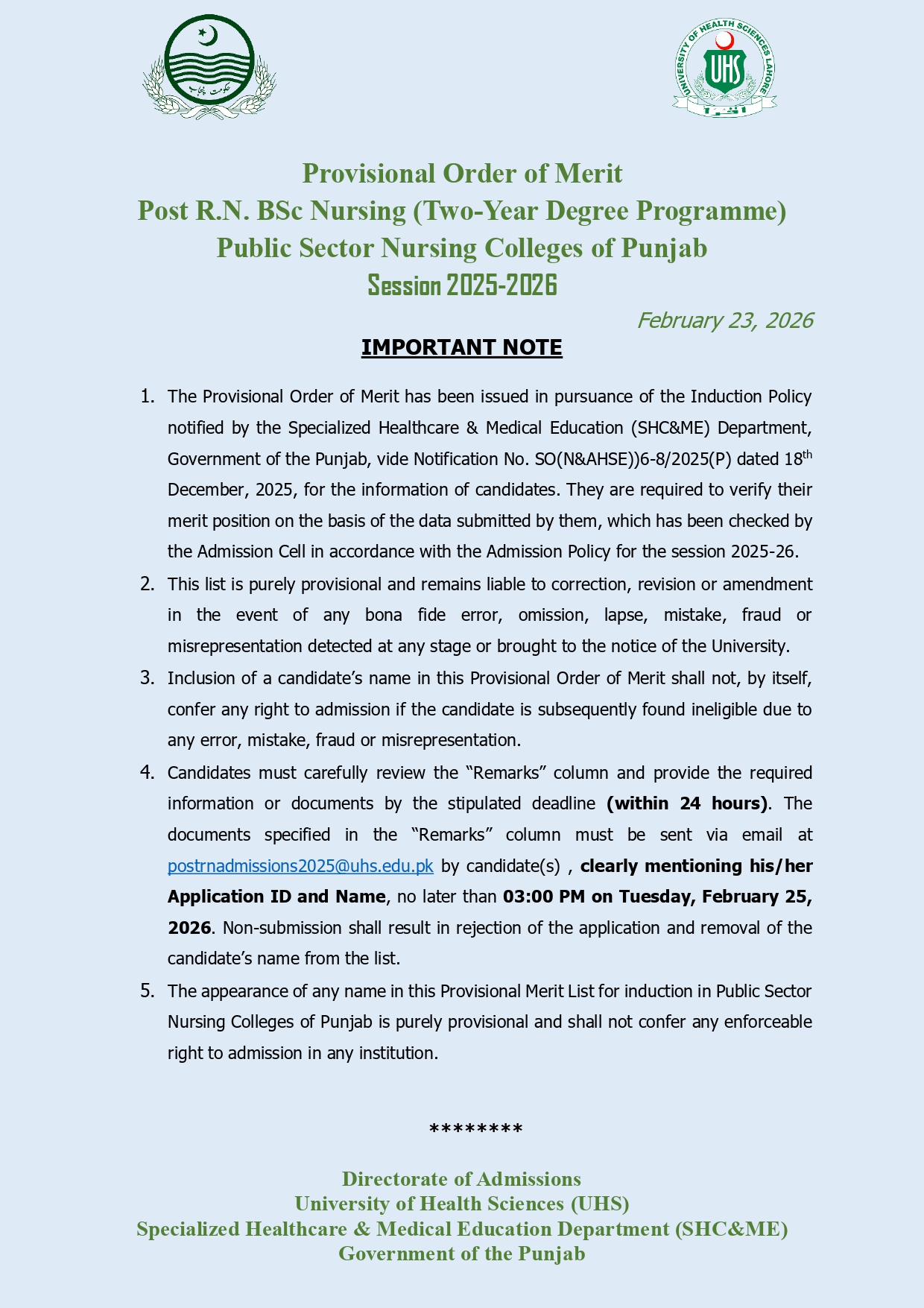Students who find discrepancies in their merit status should follow the university’s official procedure within the given timeline. The announcement by UHS reflects its commitment to maintaining transparency and merit-based admissions for the 2025-2026 nursing session. Candidates are encouraged to stay updated for further notices regarding final merit and seat allocation.
