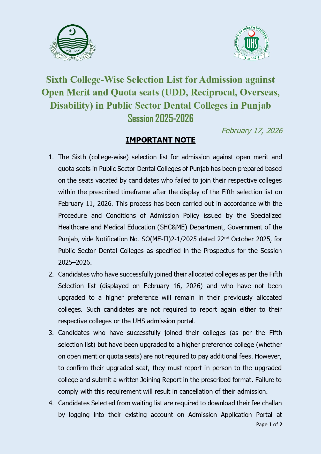Aspiring dental students across Punjab have been eagerly waiting, and the moment has finally arrived. UHS University of Health Sciences has officially announced the sixth college wise selection list for admission against open merit and quota seats in public sector dental colleges in Punjab session 2025-2026. This latest update in the BDS admission 2025-2026 cycle is crucial for candidates competing for seats in government dental institutions.