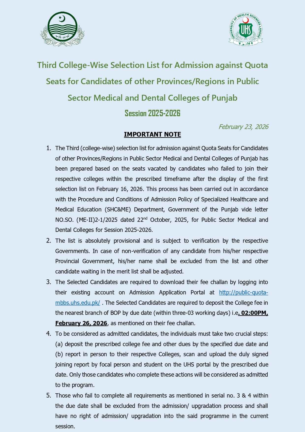 Medical aspirants from across Pakistan have received another major update as University of Health Sciences UHS has released the Third College-Wise Selection List 2026 for admission against quota seats. The list specifically covers candidates from other provinces applying to public sector medical and dental colleges of Punjab for the session 2025-2026. With increasing searches for UHS Admission 2026, this announcement is highly significant for out-of-province applicants.