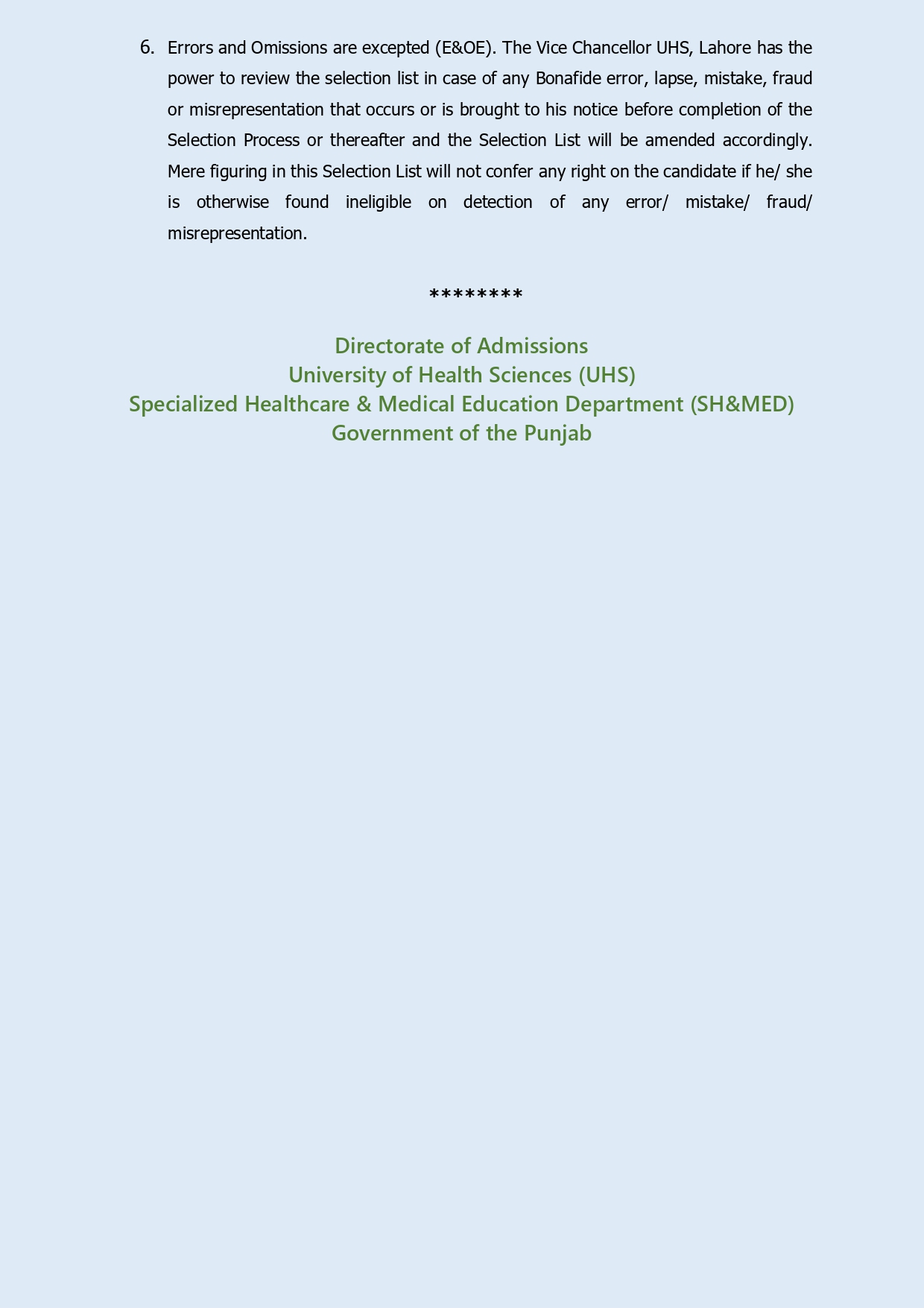 UHS Third College-Wise Selection List 2026 for Quota Seats Released