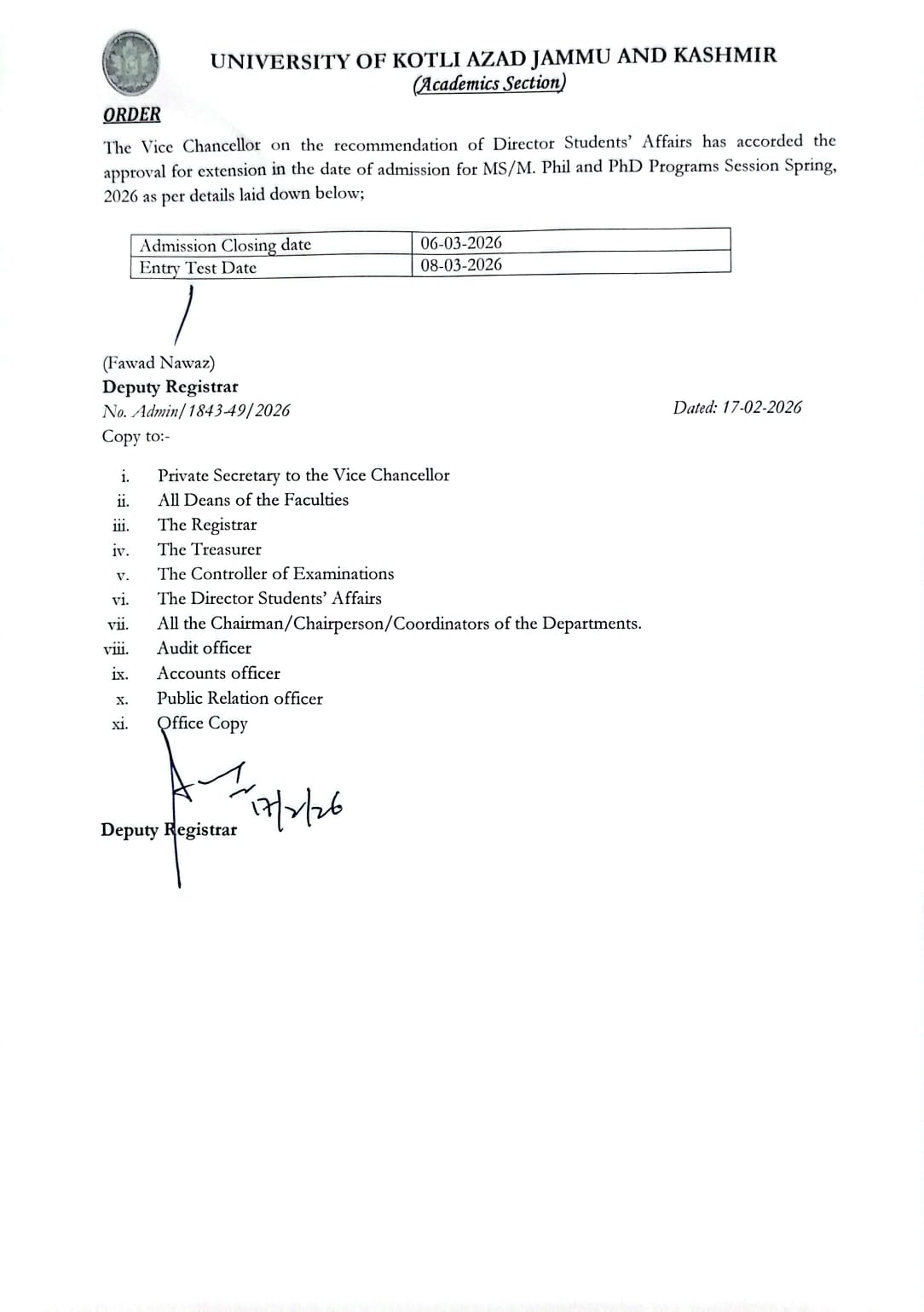 Aspiring researchers and postgraduate students have received encouraging news as University of Kotli Azad Jammu and Kashmir UKAJK has officially announced the extension in the date of admission for MPhil and PhD programs session Spring 2026. The update has generated significant interest among candidates who were finalizing their documents for Spring 2026 admissions and seeking extra time to complete application formalities.