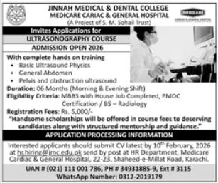 Jinnah Medical & Dental College JMDC, in collaboration with Medicare Cardiac & General Hospital a project of S. M. Sohail Trust, has officially announced that JMDC admissions 2026 are now open for its specialized Ultrasonography Course. This program is designed to provide medical practitioners with advanced technical skills in diagnostic imaging, ensuring they remain competitive in the evolving healthcare sector.