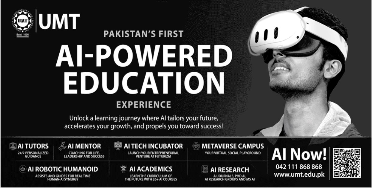 UMT Admissions are now open — and this year, we’re not just offering degrees; we’re offering a revolution in education. As Pakistan’s first AI-powered university, UMT is setting a new for academic excellence, innovation, and student success.