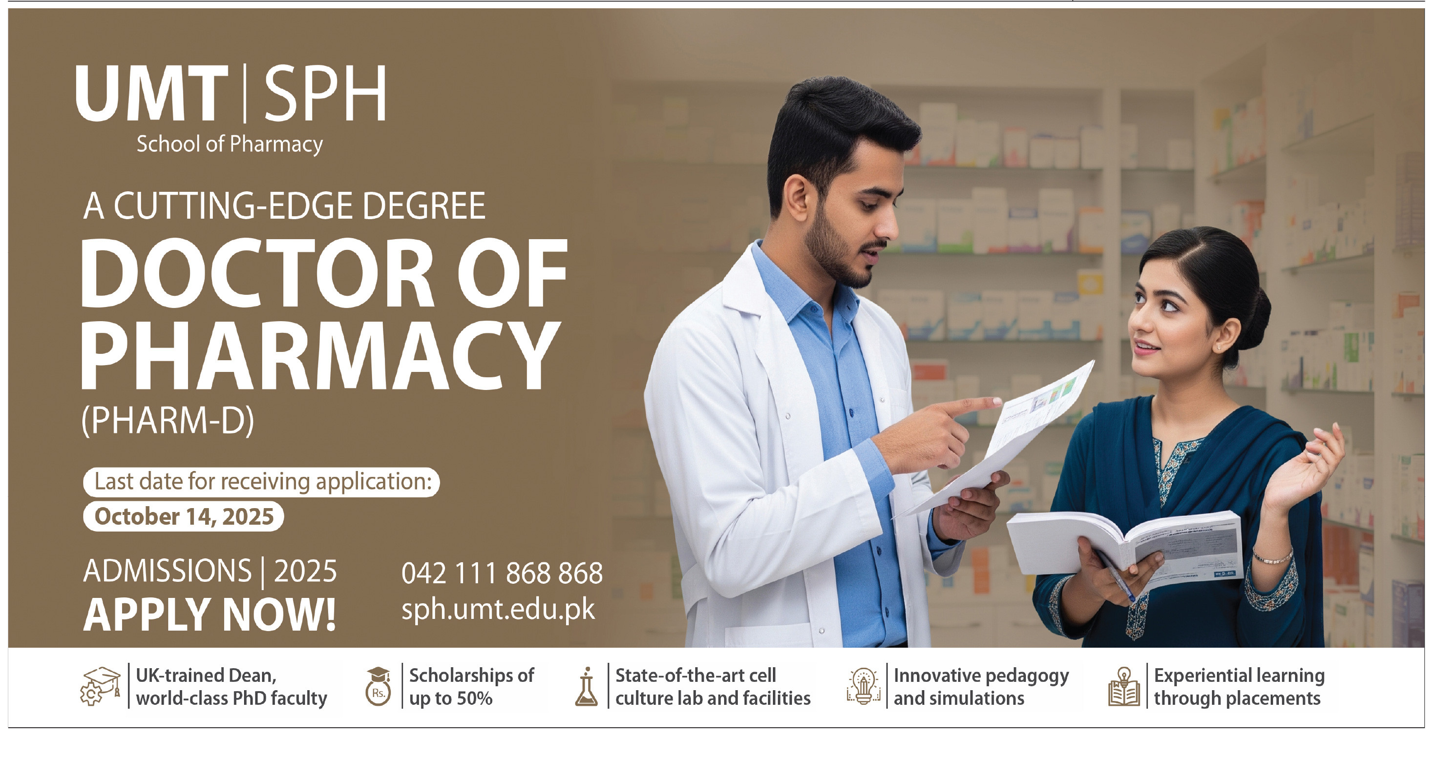 The School of Pharmacy at UMT invites applications for its Doctor of Pharmacy Pharm-D program for the academic session 2025. Designed to meet both national and international standards, the Pharm-D program at UMT prepares future pharmacists to become leaders in healthcare, research, and pharmaceutical innovation.