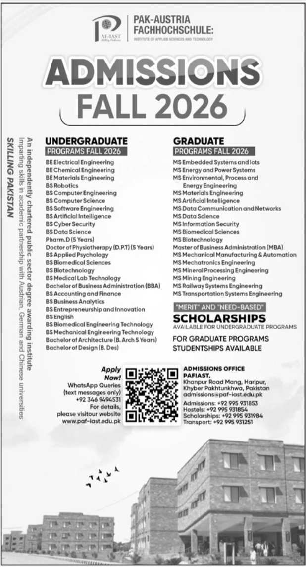 Pak-Austria Fachhochschule Institute of Applied Sciences and Technology PAF-IAST has announced Fall 2026 admissions for a wide range of undergraduate and graduate degree programmes. The institute invites applications from aspiring students seeking quality education in engineering, technology, health sciences, and business fields.