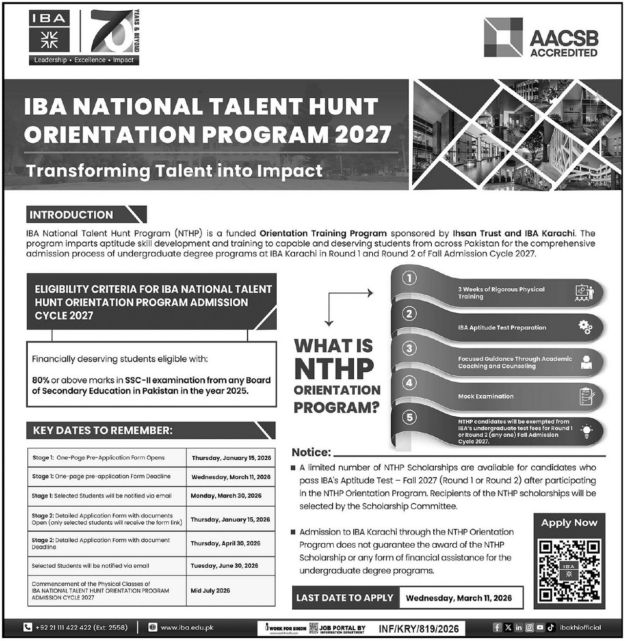 The Institute of Business Administration Karachi has officially announced the commencement of the IBA National Talent Hunt Program NTHP Orientation Training Program for the 2027 Fall Admission Cycle. This initiative, sponsored by Ihsan Trust and IBA Karachi, is designed to identify and train high-potential students from across Pakistan, preparing them for the rigorous IBA admissions 2026 and 2027 processes. By offering specialized aptitude skill development, the program aims to "Transform Talent into Impact".