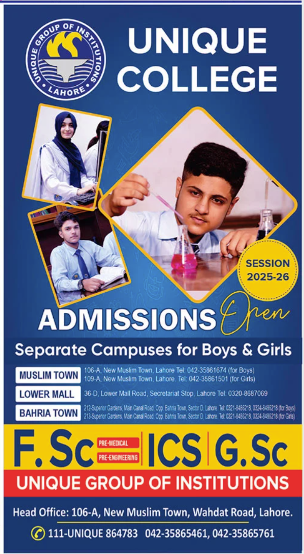 The Unique Group of Institutions, a trusted name in education since 1986, proudly announces that admissions are now open at Unique College for the academic session 2025–26. With a strong legacy of academic excellence, state-of-the-art campuses, and a focus on character building, Unique College continues to be a top choice for students aspiring for success in Pre-Medical, Pre-Engineering, ICS, and General Science G.Sc streams.