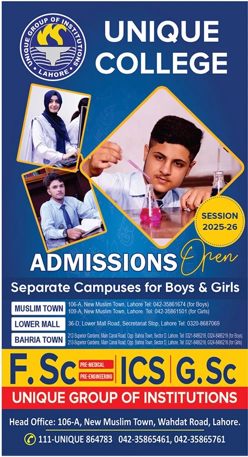 The Unique Group of Institutions, one of the most prestigious and well-reputed names in the education sector of Pakistan, proudly announces admissions open for the Session 2025–26 across all campuses of Unique College in Lahore.