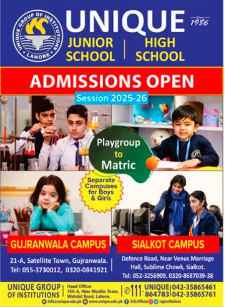 The Unique Group of Institutions is proud to announce that admissions are now open for the academic session 2025–2026, from Playgroup to Matriculation. With a strong commitment to academic excellence, character-building, and holistic development, we offer a nurturing environment where students thrive both intellectually and morally.