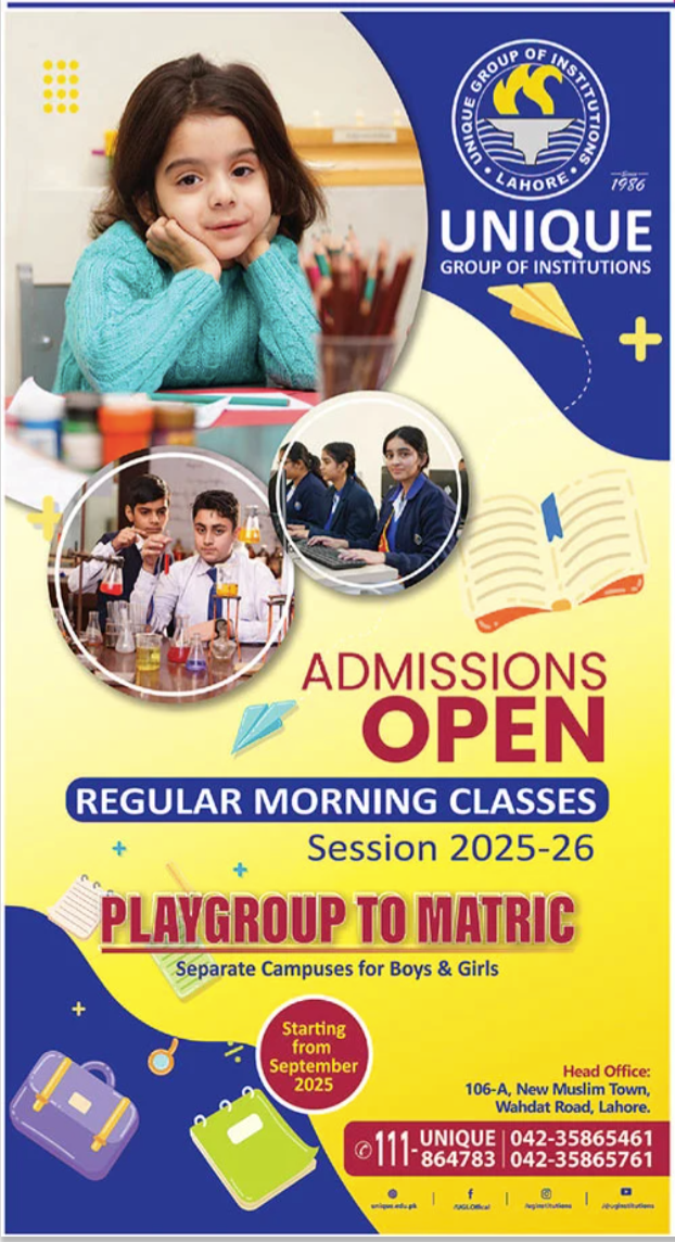 Unique Group of Institutions UGI has been a cornerstone of quality education in Lahore for nearly four decades. With an unwavering commitment to academic excellence and character development, UGI proudly opens admissions for the Session 2025-26 — from Playgroup to Matriculation.