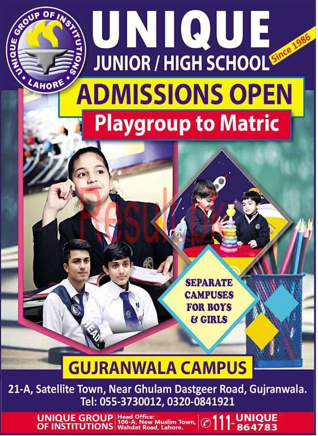 Unique Junior/ High School are offering admission for playgroup to matric class. unique school gujranwala campus offered admissions for separate campus for boys and girls.