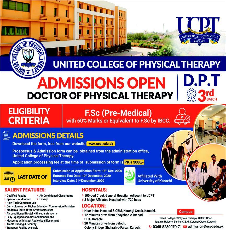 United College of Physical Therapy has announced the admission 2021 for DPT Doctor of physical Therapy in Karachi. The last date for submission of admission forms is 18th December 2021.