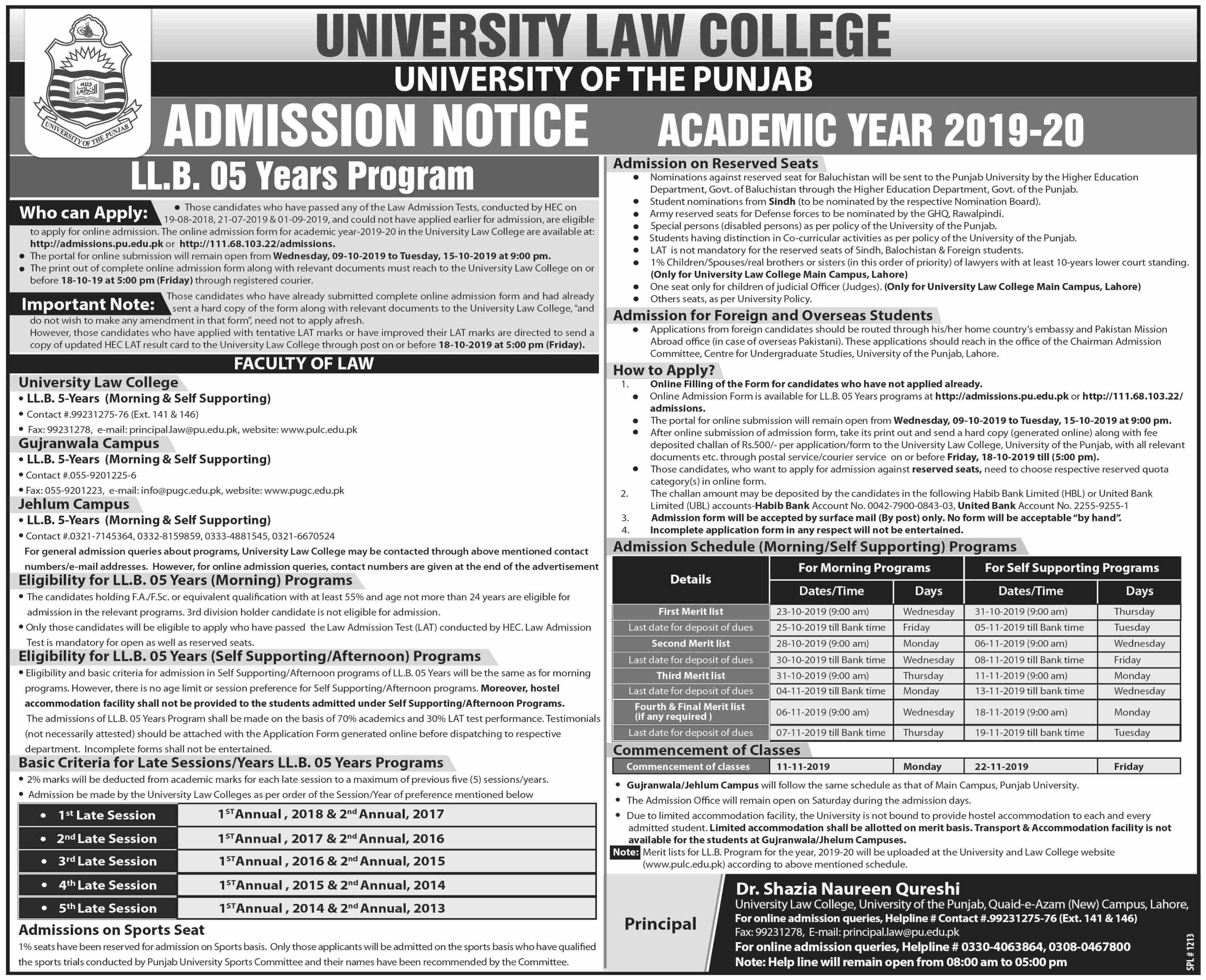 University Law College Lahore has offered admissions for 5 years LLB Program. Last date for submission of admission applications is 15 Oct 2019. Display of final Merit list date is 06 Nov 2019. Commencement of classes will be on 11 Nov 2019.