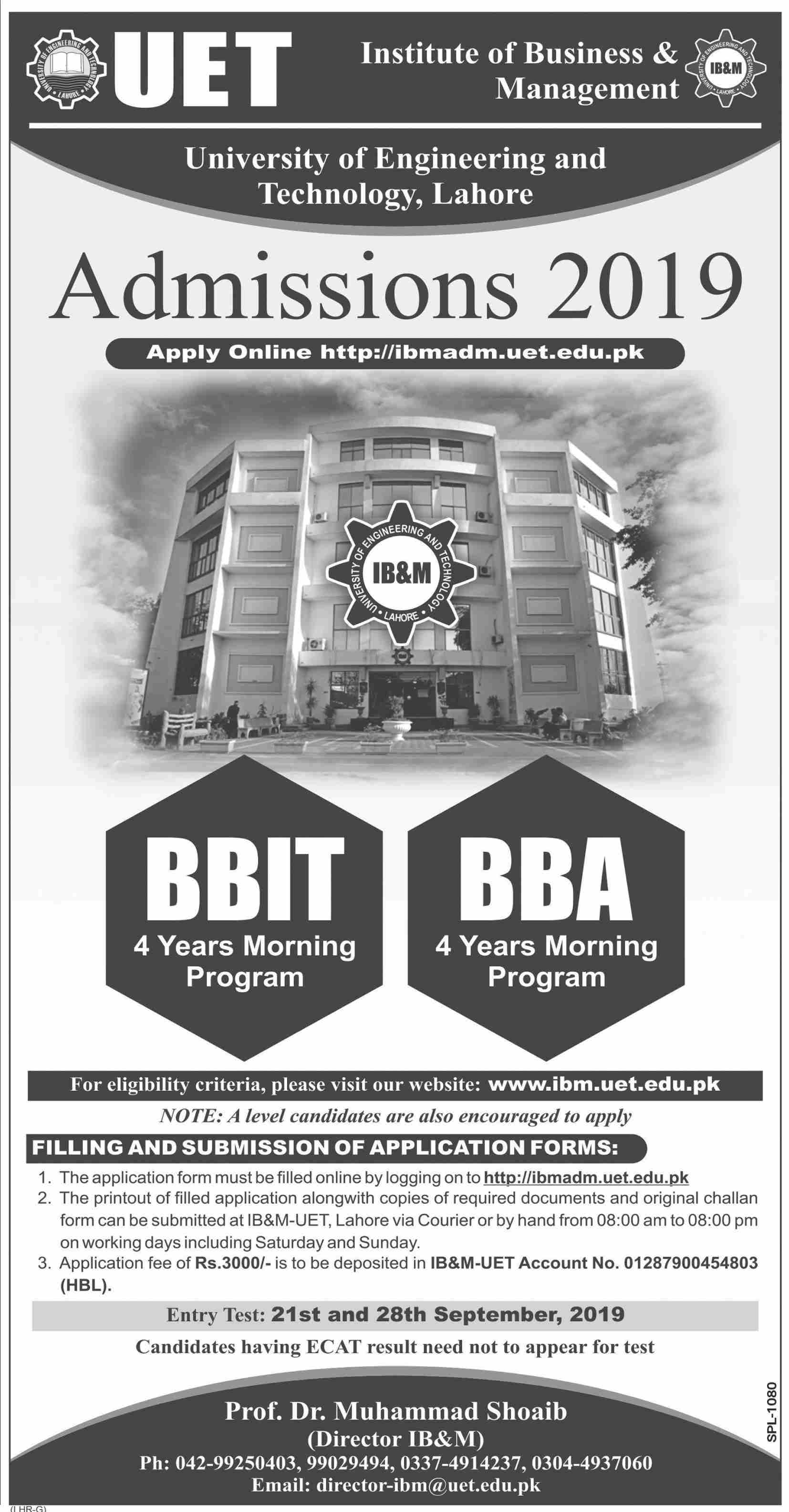 University of Engineering & Technology Lahore has announced admissions for BBIT 4 year, BBA 4 year. Entry test 21 & 28 Sep 2019. Candidate having ECAT result need not to appear in test.