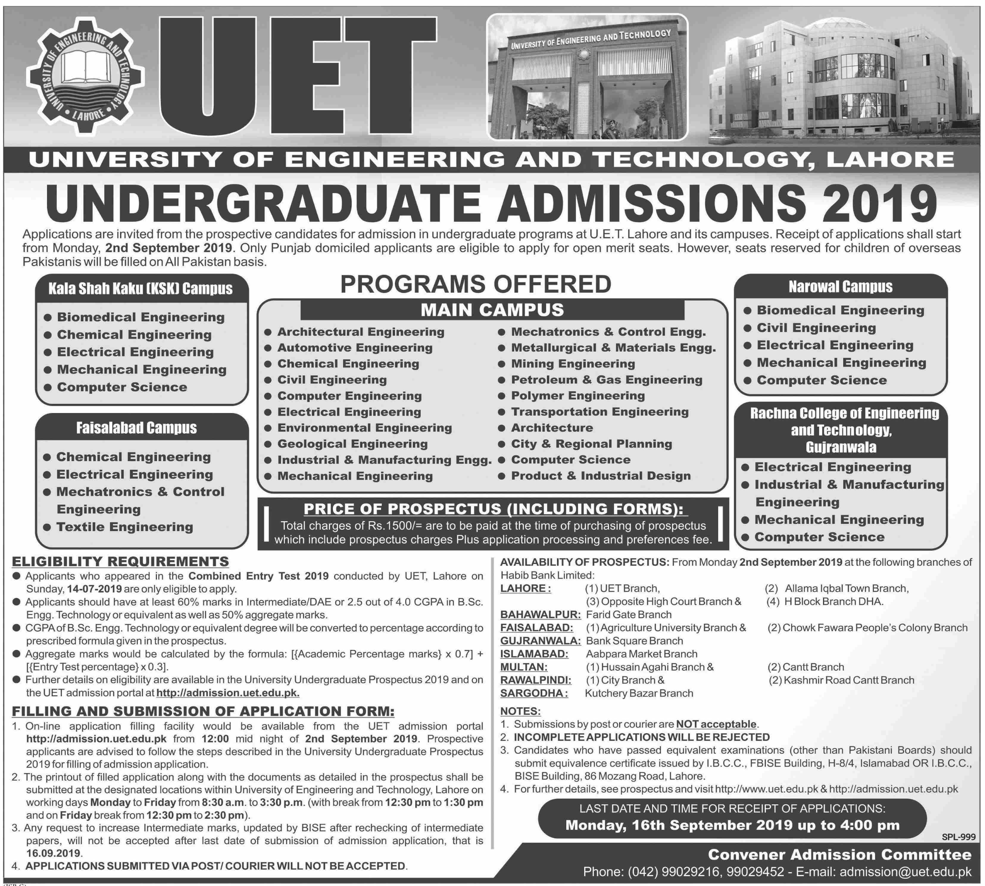 University of Engineering & Technology Lahore has announced admissions for BS in Civil Engineering, Mining Engineering, Product & Industrial design, Geological Engineering, Electrical Engineering, Computer Engineering. Last date for submission of admission application 16 Sep 2019.