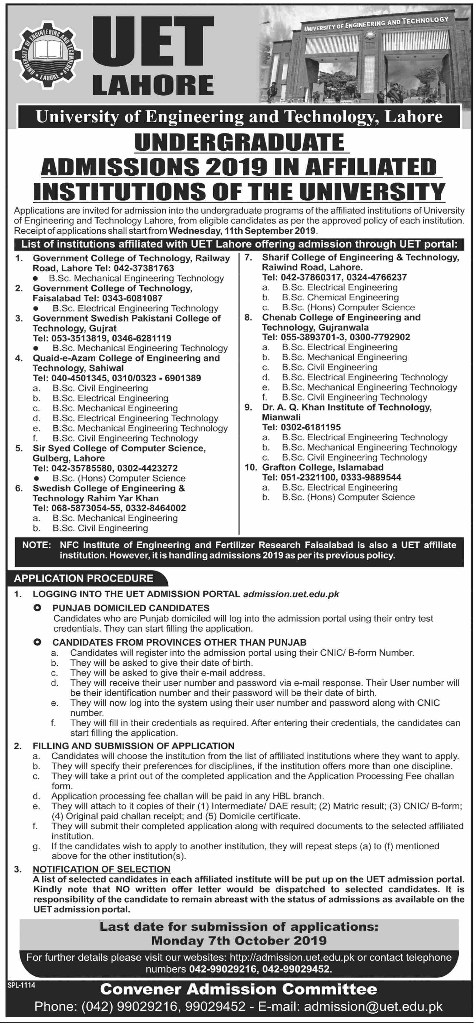 University of Engineering & Technology Lahore has announced admissions in its affiliated institutions for BSc in Civil Engineering, Computer science, Mechanical Engineering, Electrical Engineering. Last date for submission of admission forms 07 Oct 2019.