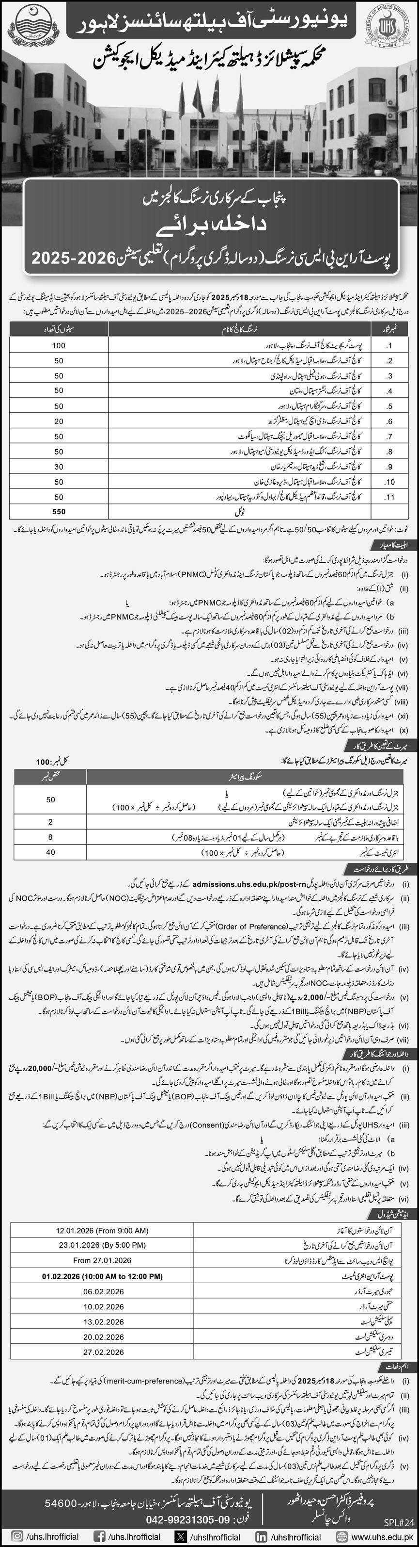 The University of Health Sciences UHS Lahore has officially opened the door for healthcare professionals to advance their clinical careers. Applications are now invited for the Post RN BSc Nursing Two-Year Degree Programme for the academic session 2025–2026. This program is specifically designed for practicing nurses in the public sector of Punjab who wish to elevate their qualifications and professional standing.