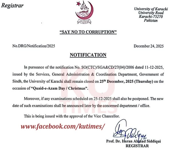Karachi, The University of Karachi UoK has officially announced that the university will remain closed on Thursday, December 25, 2025, on the occasion of Quaid-e-Azam Day and Christmas.