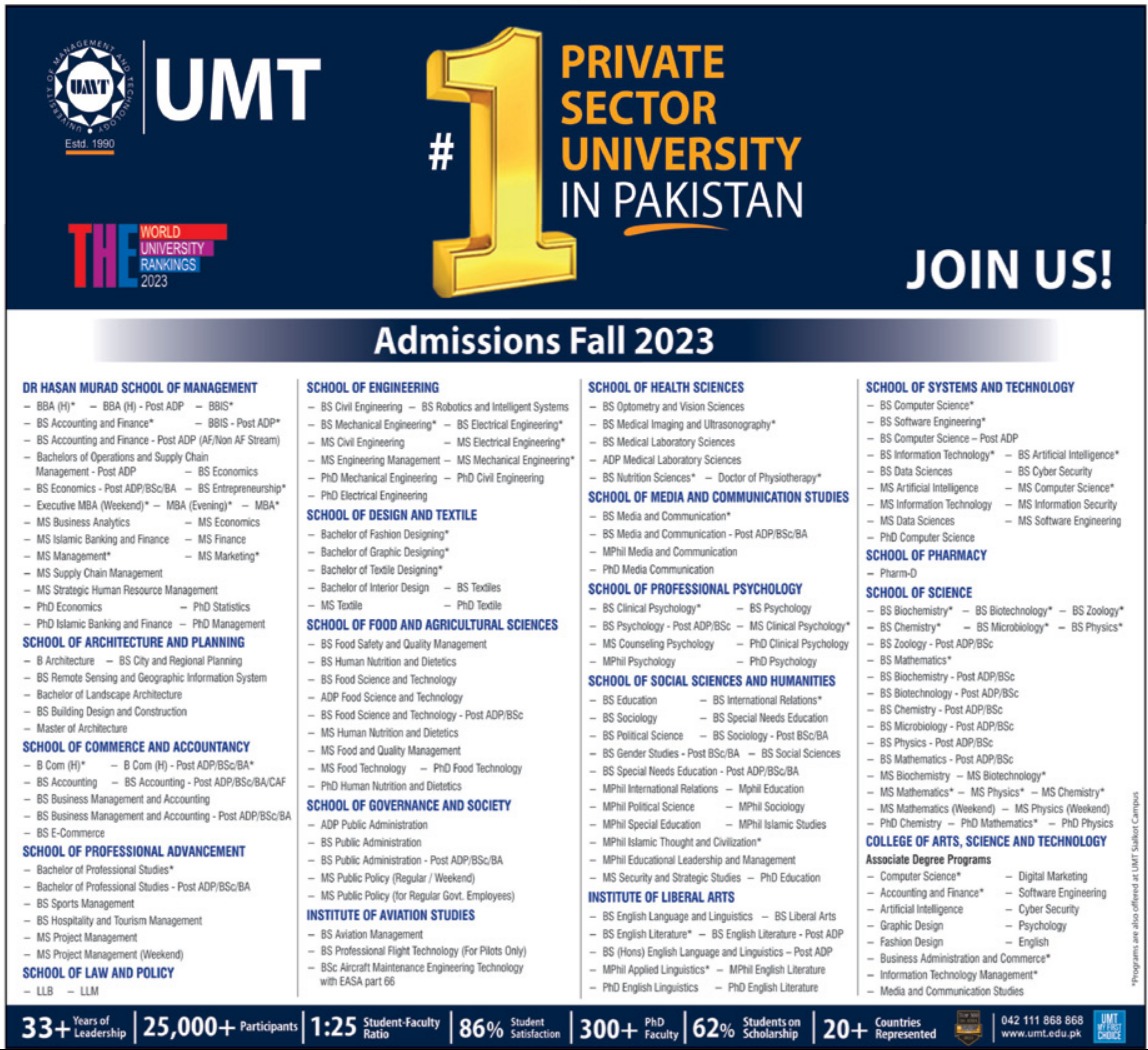 Whether students aim to shape the future of design, agriculture, aviation, governance, law, or any other discipline offered, UMTs Admissions Fall 2023 is the gateway to a world-class education and a vibrant academic journey. Dont miss the opportunity to be a part of UMTs legacy; apply online today!
