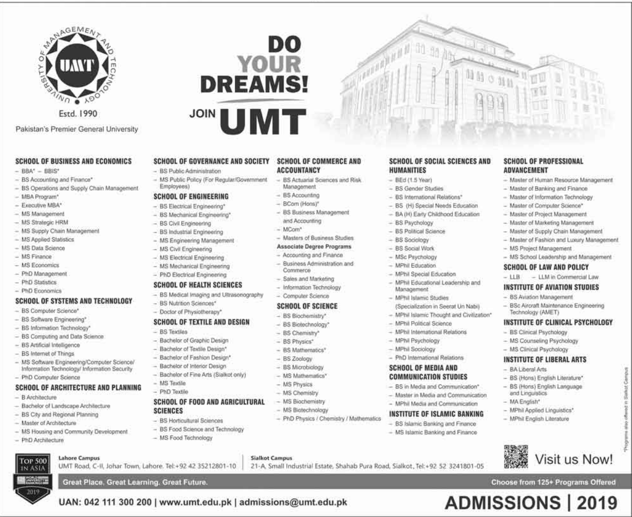 University of Management & Technology Lahore has offered admissions for Electrical Engineering, Civil Engineering, Mechanical Engineering, Psychology, Political science, Sociology, Social Work, BBA, BEd, MS in Data science, Textile, Food science, MSc in Psychology, M.Phil, PhD.