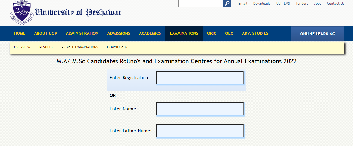 The University of Peshawar UPESH has announced the MA/MSC Candidates Roll No and Examination Centers. Candidates who registered earlier for the MA/MSc programs can check their Roll No and their Examination center from the University of Peshawar UPesh website. Candidates have to Enter their Registration Number or Their Full Name in order to get the Roll No and Examination center from the University of Peshawar Website.