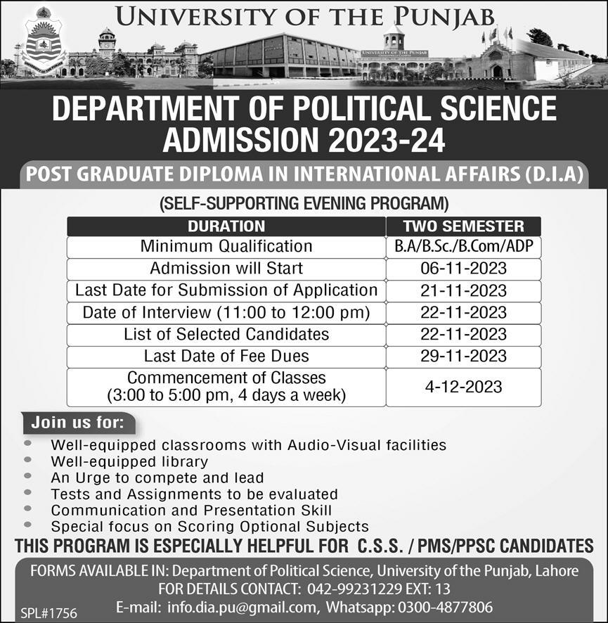 If youre ready to take your understanding of international affairs to the next level, the University of the Punjab has the perfect opportunity for you. The Department of Political Science is delighted to announce admissions for the Post Graduate Diploma in International Affairs D.I.A for the academic year 2023-24.
