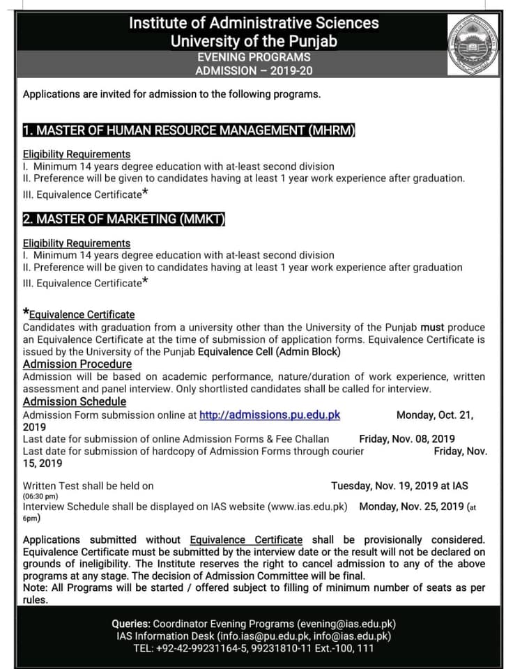 University of Punjab Lahore has now declared the Admission date for the following program.