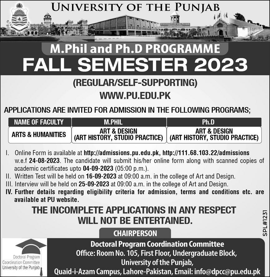 The University of Punjab is now accepting applications for its M.Phil and Ph.D programs in Art & Design for the academic year 2023. The programs offer specialized tracks in Art History, Studio Practice, and more. Prospective candidates can apply for both regular and self-supporting schemes.