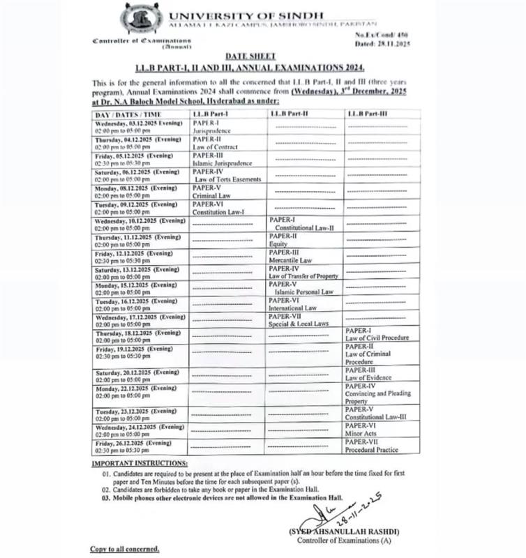 University of Sindh LLB Date Sheet 2025 Part I II III Exams Dec 3