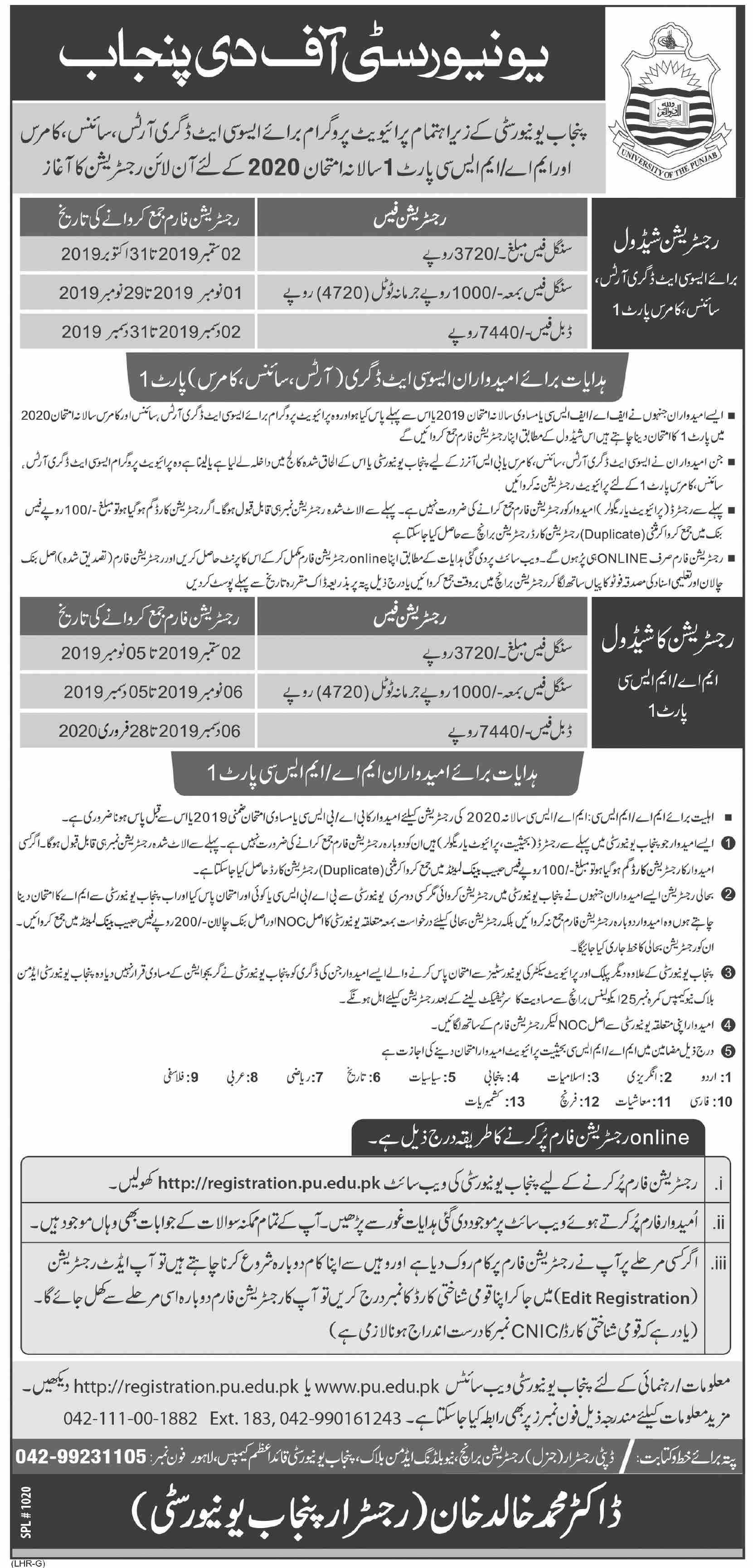 University of The Punjab Lahore has announced BS, MA/MSc Registration for part 1 Annual Exams 2020. Last date for BS registration 31 Oct 2019 & MA/MSc 05 Nov 2019.